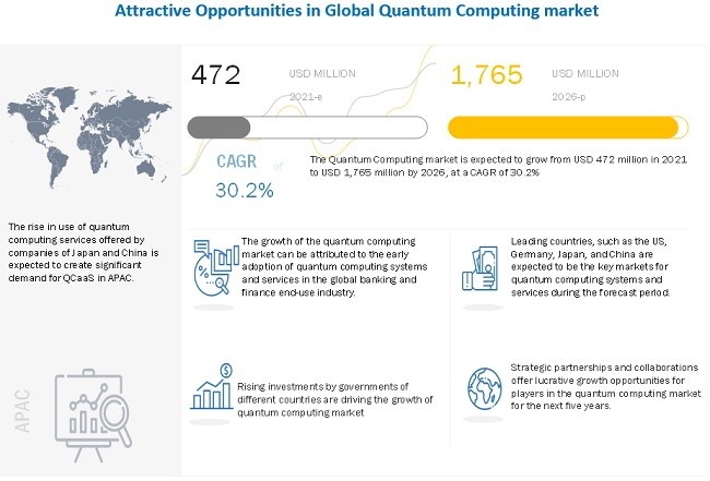 According to the recent market research report ‘Quantum Computing Market with COVID-19 impact by Offering (Systems and Services), Deployment (On Premises and Cloud Based), Application, Technology, End-use Industry and Region — Global Forecast to 2026’, published by MarketsandMarkets, the Quantum Computing market is expected to grow from USD 472 million in 2021 to USD 1,765 million by 2026, at a CAGR of 30.2%. The early adoption of quantum computing in the banking and finance sector is expected to fuel the growth of the market globally. Other key factors contributing to the growth of the quantum computing market include rising investments by governments of different countries to carry out research and development activities related to quantum computing technology. Several companies are focusing on the adoption of QCaaS post-COVID-19. This, in turn, is expected to contribute to the growth of the quantum computing market. However, stability and error correction issues are expected to restrain the growth of the market.