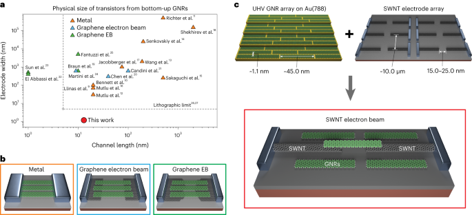 Size scaling in bottom-up GNR-based transistors with various geometries.