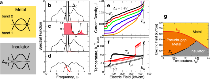 To solve this, Han decided to consider a different question: What happens when electrons already in the upper band of an insulator are pushed? Han ran a computer simulation of resistive switching that accounted for the presence of electrons in the upper band. It showed that a relatively small electric field could trigger a collapse of the gap between the lower and upper bands, creating a quantum path for the electrons to go up and down between the bands.