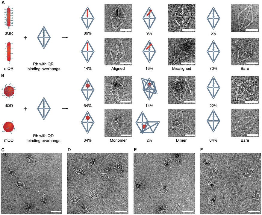 Bathe’s lab has developed computational methods that allow researchers to simply enter a target nanoscale shape they want to create, and the program will calculate the sequences of DNA that will self-assemble into the right shape. They also developed scalable fabrication methods that incorporate quantum dots into these DNA-based materials. In a 2022 paper, Bathe and Chen showed that they could use DNA to scaffold quantum dots in precise positions using scalable biological fabrication. Building on that work, they teamed up with Macfarlane’s lab to tackle the challenge of arranging quantum rods into 2D arrays, which is more difficult because the rods need to be aligned in the same direction.